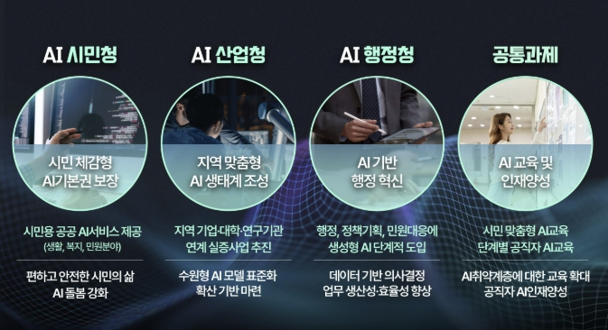 ‘시민 모두의 인공지능 기본권 실현’, ‘인공지능 산업생태계 조성’, ‘인공지능 기반 행정 혁신’을 3대 목표로 설정하고, ▲인공지능(AI) 시민청 ▲인공지능(AI) 산업청 ▲인공지능(AI) 행정청 ▲인공지능 교육·인재 양성으로 분야를 나눠 인공지능 기반 사업을 추진한다.