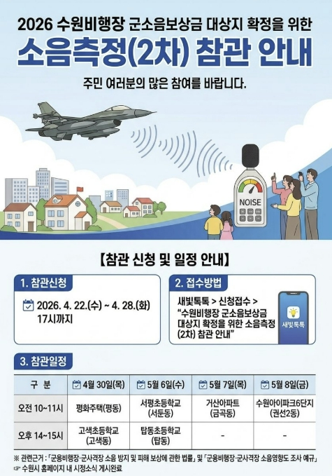 수원시 관계자는 “소음 영향도 조사는 주민 보상과 직결되는 중요한 절차인 만큼 시민 참여로 신뢰도를 높일 것”이라며 “관심 있는 시민들이 적극적으로 참여해 주길 바란다”고 말했다.