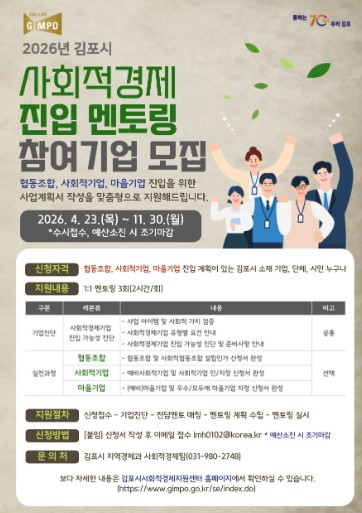 모집 대상은 김포시 소재 기업, 단체 및 시민으로, 사회적경제기업 설립 또는 전환을 계획 중인 경우 누구나 신청할 수 있다. 사전상담 및 기업진단을 통해 선정된 기업은 소셜 미션과 사업모델의 적정성을 검증받고, 이후 협동조합·사회적기업·마을기업 등 인·지정 신청에 필요한 사업계획서 완성까지 단계별 맞춤 지원을 받게 된다. 또한, 지속가능한 사회적경제기업으로 성장할 수 있도록 판로, 홍보, 유관 사업 정보 제공 등 후속 지원이 이어질 예정이다