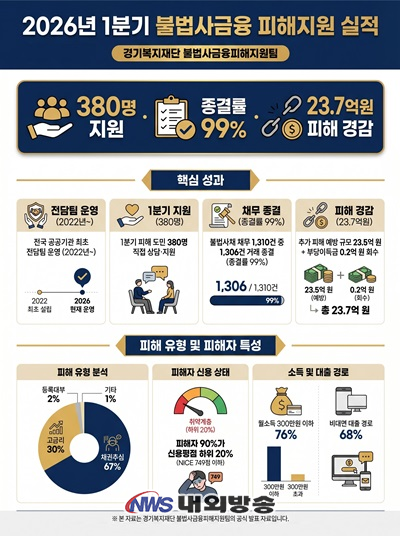 경기복지재단이 2022년부터 구축해 온 현장 중심 대응 모델은 이번 분기 정책 확산의 전기를 맞은 것으로 나타났다. 지난 3월 9일, 재단은 금융위원회·금융감독원·서민금융진흥원·신용회복위원회·대한법률구조공단· 서울시복지재단 등과 '불법사금융 원스톱 종합·전담 지원시스템 구축을 위한 업무협력 협약'을 체결했다. 경기도의 전담부서 설치 및 피해자 직접 대응 방식이 정책 설계 과정에 활용되었으며, 재단이 3년간 축적한 4,315명 지원 실적과 1만 7천여 건의 채무 종결 경험이 원스톱 지원체계의 핵심 모델로 반영된 것으로 나타났다.