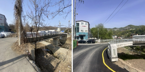 용인특례시 처인구가 모현읍 동림1교 가각부 정비를 마무리했다. 사진은 공사 전(왼쪽)과 공사 후(오른쪽) 모습