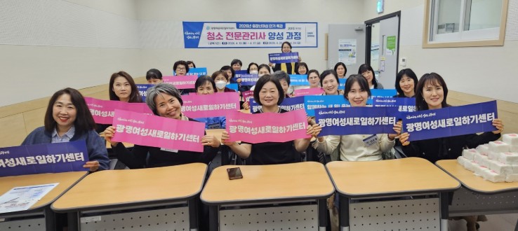 지난 17일 광명여성새로일하기센터에서 '청소전문관리사 양성 과정'을 진행하고 기념사진을 촬영하고 있다.
