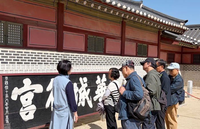 시각장애인 참여자들이 문화관광해설사의 안내를 받으며 화성행궁을 관람하고 있다.