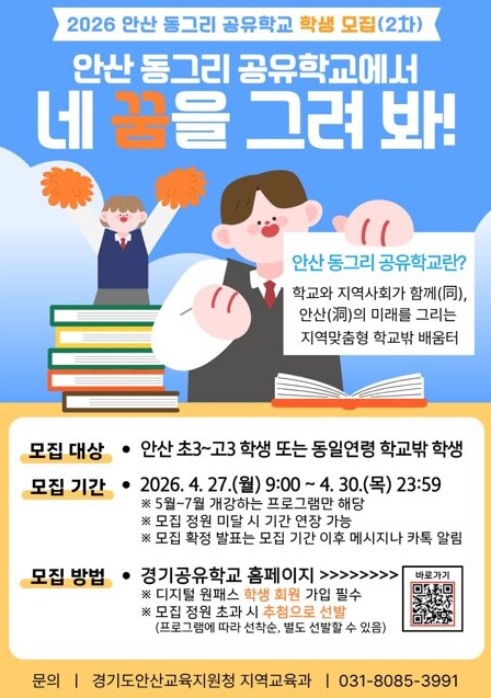 한편 안산교육지원청은 오는 30일까지 나흘간 약 50개 과정, 900여 명 규모의 ‘안산 동그리 공유학교’ 2차 참여 학생을 모집한다. 참여를 희망하는 경우 경기공유학교 누리집에서 신청할 수 있다.