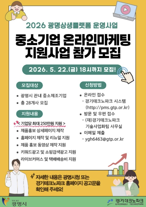 시는 관내 중소기업의 온라인 시장 진출과 판로 확대를 지원하는 ‘2026년 광명시 중소기업 맞춤형 온라인 마케팅 지원사업’ 참여기업을 오는 5월 22일까지 모집한다.