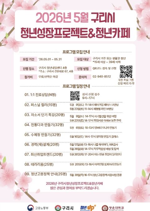 구리시 관계자는 “이번 5월 프로그램은 청년들이 자신을 발견하고, 내일을 설계하며, 지역 안에서 함께 성장할 수 있도록 준비한 자리”라며 “진로와 취업을 고민하는 청년은 물론, 새로운 경험과 교류를 원하는 청년들의 많은 관심과 참여를 바란다.”라고 말했다.