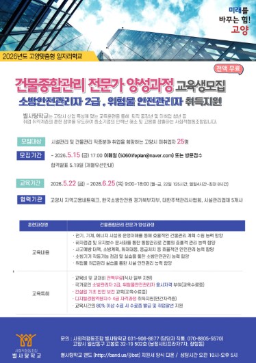 교육은 오는 5월 22일부터 6월 25일까지 진행되며, 전기·기계·에너지 시설 운영 등 건물관리 전반에 대한 이론과 실무를 비롯해 사고 예방 대책, 화재 대응, 위험물 취급관리 실습 등 현장 중심의 내용으로 구성됐다.