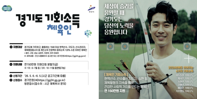 신청 대상은 공고일 기준인 2026년 5월 6일 현재 안산시에 주민등록을 둔 19세 이상 체육인이다. 2007년 12월 31일 이전 출생자여야 하며, 기준 중위소득 120% 수준 이하인 경우 신청할 수 있다.