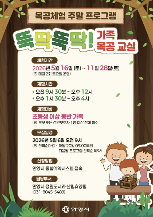 가족 목공 교실은 서울대 안양수목원 산림복합체험장(예술공원로 280)에서 진행되며, 참여 가족이 함께 목제품 1종을 제작하는 체험으로 운영된다. 만들기 중심의 체험을 통해 아이들은 손으로 직접 결과물을 완성하며 성취감을 느끼고, 보호자는 자녀와 함께 과정에 참여하며 가족 유대감을 높일 수 있을 것으로 기대된다.