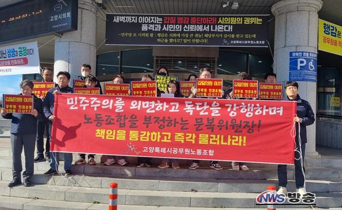 ³ëÁ¶´Â Áö³ 4ÀÏ ÀÇȸ°Ç¹° ¾Õ¿¡¼ ±âÀÚȸ°ßȸ°ßÀ» ¿°í "³ëµ¿Á¶ÇÕÀÌ ¸Å³â ÁøÇàÇØ ¿Â °ø¹«¿ø°ú ½ÃÀÇȸÀÇ »óÈ£Á¸Áß ¹®È Á¤Âø Ä·ÆäÀÎÀÌ ¿ÃÇØ´Â ¹ÎÁÖ´ç ¼Ò¼Ó K »óÀÓÀ§¿øÀåÀÇ µ¶´ÜÀû °áÁ¤À¸·Î °ÅºÎµÆ´Ù"¸ç "ÀÌ´Â °ø¹«¿ø ³ëµ¿Àڵ鿡 ´ëÇÑ ¹«½ÃÀ̸ç, ³ëµ¿ÀÚµé À§¿¡ ±º¸²Çϰڴٴ ºñ»ó½ÄÀûÀÎ ±ÇÀ§ÁÖÀÇÀÇ ¹ß·Î"¶ó°í ³¯À» ¼¼¿ü´Ù.