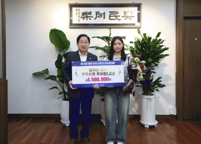 À̹ø Àü´Þ½Ä¿¡´Â ±èÇÏÀº ¼±¼ö¿Í À±¼ºÇö ³²¾çÁÖ½ÃüÀ°È¸ ȸÀå, À¯Àç°£ ³²¾çÁֽà ´ç±¸¿¬¸Í ȸÀå°ú ±èÇü±â ¼ö¼®ºÎȸÀåÀÌ ÇÔ²² Âü¼®ÇØ ÃàÇÏ¿Í °Ý·ÁÀÇ ¹Ú¼ö¸¦ º¸³Â´Ù. ÁÖ±¤´ö ½ÃÀåÀº ±è ¼±¼ö¿¡°Ô Á÷Á¢ Æ÷»ó±ÝÀ» Àü´ÞÇÏ¸ç µû¶æÇÑ °Ý·Á¿Í ÃàÇÏ Àλ縦 ÀüÇß´Ù.