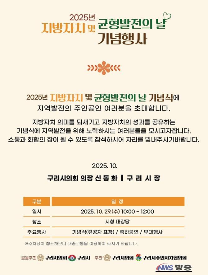 ¿ÃÇØ °³ÃֵǴ Áö¹æÀÚÄ¡ ¹× ±ÕÇü¹ßÀüÀÇ ³¯ ±â³ä½ÄÀº ±¸¸®½ÃÀÇȸ¿Í ±¸¸®½Ã¿Í Áö¹æÀÚÄ¡ÀÇ ¾ç ¼ö·¹¹ÙÄû·Î¼ °øµ¿ÁÖÃÖÇϰí, ±¸¸®½ÃÁÖ¹ÎÀÚÄ¡ÇùÀÇȸ°¡ °øµ¿ÁÖ°üÇÏ¿© Áö¿ªÁÖ¹ÎÀÇ Àû±ØÀûÀÎ Âü¿©¿Í ¼ÒÅëÀ¸·Î ÁøÇàµÈ´Ù.