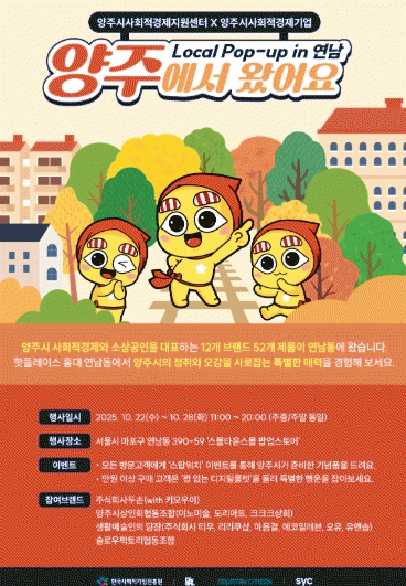 ¡®¾çÁÖ¿¡¼ ¿Ô¾î¿ä(Local Pop-up in ¿¬³²)¡¯´Â 10¿ù 22ÀÏ 28ÀÏ ¿ÀÀü 11½ÃºÎÅÍ ¿ÀÈÄ 8½Ã±îÁö(ÁÖÁß¡¤ÁÖ¸» µ¿ÀÏ) ¿î¿µµÇ¸ç, ¹æ¹®°´À» À§ÇÑ ¡®½ºÅÆÇÁ À̺¥Æ®¡¯¿Í ¡®¾çÁֽà µðÁöÅÐ ·ê·¿ °æÇ° Çà»ç¡¯ µî ´Ù¾çÇÑ Ã¼Çè À̺¥Æ®µµ ÇÔ²² ÁøÇàÇÑ´Ù.