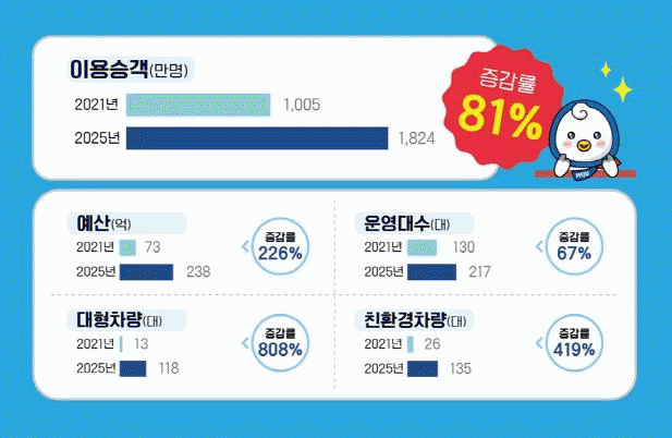 ÀÌ·¯ÇÑ Áö¿ø È®´ë¿¡ ÈûÀÔ¾î ¸¶À»¹ö½º ÀÌ¿ë ½Â°´Àº 2021³â 1,005¸¸ ¸í¿¡¼ 2025³â 1,824¸¸ ¸íÀ¸·Î ´Ã¸ç 81% Áõ°¡ÇÑ °ÍÀ¸·Î ³ªÅ¸³µ´Ù.