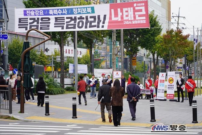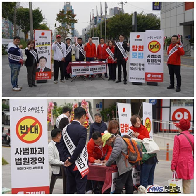 (NWS¹æ¼Û=Çѽ¸ñ ±âÀÚ)±¹¹ÎÀÇÈû ±¸¸®½Ã ´ç¿øÇùÀÇȸ(À§¿øÀå ³ªÅ±Ù)´Â 27ÀÏ ±¸¸®½Ã µ¹´Ù¸®»ç°Å¸® Àαٿ¡¼ ¡®ÀÌÀç¸í ´ëÇ¥¿Í ´õºÒ¾î¹ÎÁÖ´çÀÇ »ç¹ýÆÄ±« ±ÔꡝÀ» À§ÇÑ ¼¸í¿îµ¿°ú ´ç¿ø°¡ÀÔ Ä·ÆäÀÎÀ» Àü°³Çß´Ù.