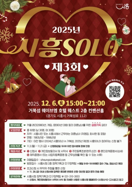 | "½ÃÈï¿¡¼ ³» ¹ÝÂÊ Ã£¾Æº¸ÀÚ" '2025³â Á¦3ȸ ½ÃÈï¼Ö·Î(SOLO)' ¹ÌÈ¥³²³à Âü°¡ÀÚ ¸ðÁý  12¿ù 6ÀÏ °ÅºÏ¼¶ ¿þÀ̺꿥ȣÅÚ¼ °³ÃÖ¡¦ ¡°Ã»ÃáµéÀÇ ÀÚ¿¬½º·¯¿î ¸¸³²°ú ¼ÒÅëÀÇ À塱 =Çѽ¸ñ ±âÀÚ   |
