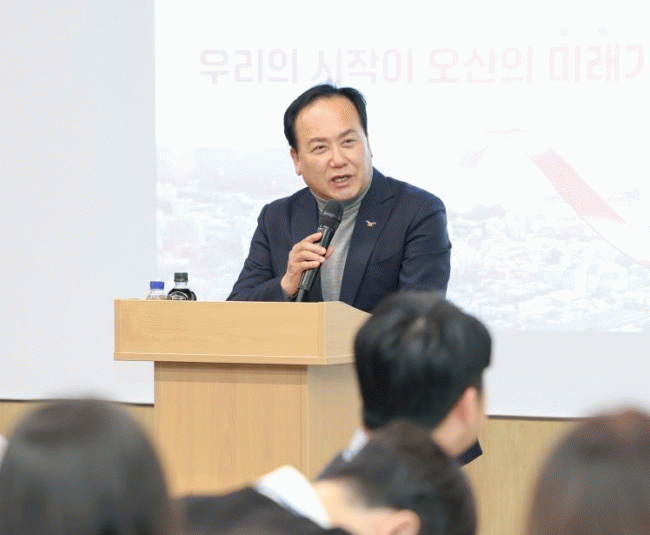 ƯÈ÷, À̱ÇÀç ¿À»ê½ÃÀåÀÌ Á÷Á¢ ¿¬¼ö ÇöÀåÀ» ¹æ¹®ÇØ ¡®¹Î¼± 8±â ¿À»ê½ÃÀÇ ºñÀü°ú ÁÖ¿ä Á¤Ã¥¡¯¿¡ ´ëÇÑ Æ¯°À» ÁøÇàÇϸç, ¡°¿©·¯ºÐÀÇ Ã¹°ÉÀ½ÀÌ ÇÑÃþ ´õ ºû³¯ ¿À»êÀ» ¸¸µå´Â ¿øµ¿·ÂÀÌ µÇ±â¸¦ ¹Ù¶õ´Ù¡±¸ç ½Å±Ô °øÁ÷Àڵ鿡°Ô µû¶æÇÑ °Ý·ÁÀÇ ¸Þ½ÃÁö¸¦ ÀüÇß´Ù.