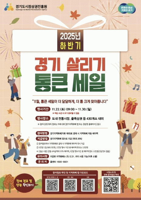 ÅëÅ« ¼¼ÀÏ Çà»ç´Â ¿¹»êÀÌ ¼ÒÁøµÉ °æ¿ì Á¶±â Á¾·áµÉ ¼ö ÀÖ´Ù. Áö±ÞµÈ Áö¿ªÈÆó´Â ¿ÃÇØ 12¿ù 31ÀϱîÁö »ç¿ëÇÒ ¼ö ÀÖÀ¸¸ç, ÀÌÈÄ¿¡´Â ÀÚµ¿ ¼Ò¸êµÈ´Ù. »ç¾÷ °ü·Ã ¹®ÀÇ´Â Äݼ¾ÅÍ·Î ÇÏ¸é µÈ´Ù. Çà»ç ³»¿ë°ú Âü¿© »ó±Ç Á¤º¸´Â ¡®°æ±âÁö¿ªÈÆó¡¯ ¾Û ¶Ç´Â °æ±âµµ½ÃÀå»ó±ÇÁøÈï¿ø ȨÆäÀÌÁö¿¡¼ È®ÀÎÇÒ ¼ö ÀÖ´Ù.