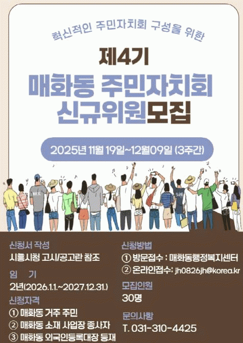 [NWS¹æ¼Û=Çѽ¸ñ ±âÀÚ]½ÃÈï½Ã ¸Åȵ¿ ÇàÁ¤º¹Áö¼¾ÅÍ´Â 12¿ù 9ÀϱîÁö ¡®Á¦4±â ¸Åȵ¿ ÁÖ¹ÎÀÚġȸ¡¯ ½Å±ÔÀ§¿ø 30¸íÀ» °ø°³ ¸ðÁýÇÑ´Ù. ½ÅûÀº ¸Åȵ¿ ÇàÁ¤º¹Áö¼¾ÅÍ ¹æ¹® ¶Ç´Â ÀüÀÚ¿ìÆíÀ» ÅëÇØ °¡´ÉÇÏ´Ù.
