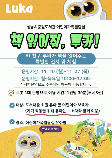 [NWS¹æ¼Û=Çѽ¸ñ ±âÀÚ]¼º³²µµ½Ã°³¹ß°ø»ç Áß¿øµµ¼°üÀº Áö¿ª ¾î¸°À̵鿡°Ô ÀΰøÁö´É(AI) ±â¼úÀ» Ȱ¿ëÇÑ »õ·Î¿î µ¶¼ üÇè ±âȸ¸¦ Á¦°øÇϱâ À§ÇØ ¡®Ã¥ Ä£±¸ ·Îº¿, ·çÄ«(LUKA)¡¯¸¦ ¿À´Â 12¿ù±îÁö ¿î¿µÇÑ´Ù°í 21ÀÏ ¹àÇû´Ù.