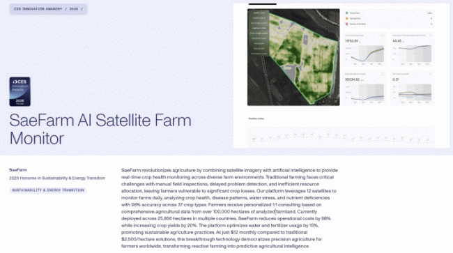 ÀÌ ±â¼úÀº ³»³â 1¿ù ¿­¸®´Â CES 2026¿¡¼­ ¡®SaeFarm AI Satellite Farm Monitor(»õÆÊ ³ó¸²À§¼º ÀΰøÁö´É ºÐ¼®)¡¯ ¼­ºñ½º·Î ÃâǰµÅ °ø°³µÉ ¿¹Á¤ÀÌ´Ù.