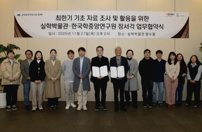 [NWS¹æ¼Û=Çѽ¸ñ ±âÀÚ]°æ±â¹®ÈÀç´Ü ½ÇÇйڹ°°ü°ú Çѱ¹ÇÐÁß¾Ó¿¬±¸¿ø Àå¼°¢Àº ¿À´Â 11¿ù 27ÀÏ ¿ÀÈÄ 2½Ã ¿¼öȦ¿¡¼ ¹®ÈÀ¯»êÀÇ º¸Á¸ ? °ü¸® ¹× Ȱ¿ë, Çмú¿¬±¸¿Í ¹®È¿¹¼ú ÁøÈïÀ» À§ÇÑ ¾÷¹«Çù¾àÀ» ü°áÇÑ´Ù. µÎ ±â°üÀº ¿À·£ ¼¼¿ù Èð¾îÁ® ÀÖ´ø ÃÖÇѱâ(õËùÓÑ», 1803~1877)¿¡ ´ëÇÑ ±â·ÏÀÇ °áÀ» ´Ù½Ã ÀÕ°í, Çй®°ú À¯»êÀÌ ¼·Î¸¦ ºñÃß´Â ¿¬´ëÀÇ ÀåÀ» ¿°íÀÚ À̹ø Çù¾àÀ» ¸¶·ÃÇß´Ù.