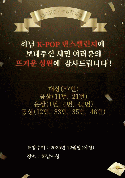 [NWS¹æ¼Û=Çѽ¸ñ ±âÀÚ]µµ½É °÷°÷À» ¹è°æÀ¸·Î, ½Ã¹ÎµéÀÌ ÃãÀ¸·Î ¿Ï¼ºÇÑ ¡®Çϳ² K-POP ´í½º 縰Áö¡¯°¡ ¶ß°Å¿î ¿±â ¼Ó¿¡ ¸·À» ³»·È´Ù. ½Ã´Â 11¿ù 5ÀϺÎÅÍ 26ÀϱîÁö ÁøÇàµÈ ¡®Çϳ² K-POP ´í½º 縰Áö¡¯ÀÇ ÃÖÁ¾ ¼ö»óÀÛ 10°³ ÆÀ(¶Ç´Â °³ÀÎ)À» ¼±Á¤Çß´Ù°í 1ÀÏ ¹àÇû´Ù.