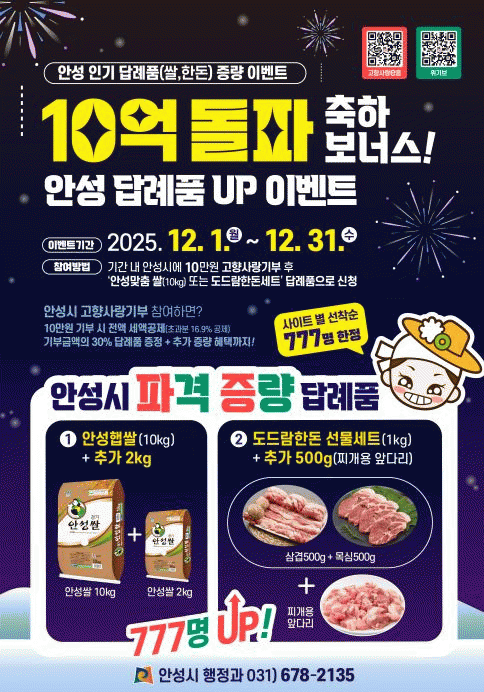| 10¾ï µ¹ÆÄ °¨»çÀÇ ¸¶À½, ¾È¼º ´ëÇ¥ ´ä·Êǰ Áõ·® À̺¥Æ® ½ÃÀÛ ¾È¼º½Ã °íÇâ»ç¶û±âºÎ ±Þ¼ºÀ塦 °¨»ç À̺¥Æ®·Î Áö¿ª ³óÃà»ê¹° ¾Ë¸°´Ù =Çѽ¸ñ ±âÀÚ |