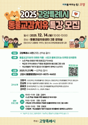 | °í¾ç½Ã, 2025 µ¿¹°±³°¨Ä¡À¯ Ư° ¼ö°»ý ¸ðÁý 12¿ù 14ÀÏ ¿ÀÀü 10½Ã µ¿¹°±³°¨Ä¡À¯¼¾ÅÍ 2Ãþ¡¦°í¾ç½Ã¹Î ´©±¸³ª Âü¿© =Çѽ¸ñ ±âÀÚ |