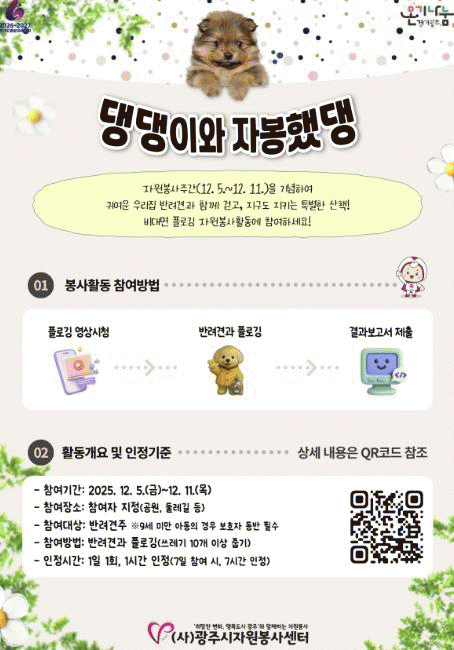Âü¿©´ë»óÀº 1365ÀÚ¿øºÀ»çÆ÷Åп¡ ȸ¿ø°¡ÀÔÇÑ ¹Ý·Á°ßÁÖÀ̸ç, 9¼¼ ¹Ì¸¸ÀÇ ¾Æµ¿Àº º¸È£ÀÚ µ¿¹Ý ½Ã Âü¿© °¡´ÉÇÏ´Ù. Ȱµ¿ ±â°£ µ¿¾È ¹Ý·Á°ß°ú Ç÷αëÀ» ÁøÇàÇÑ ÈÄ, °á°úº¸°í¼¸¦ Á¦ÃâÇϸé 1ÀÏ ÃÖ´ë 1ȸ, 1½Ã°£ÀÇ ºÀ»çȰµ¿ ½Ã°£ÀÌ ÀÎÁ¤µÈ´Ù.