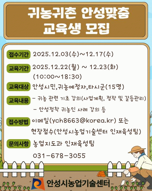±³À° Á¢¼ö ¹æ¹ýÀº ¾È¼º½Ã³ó¾÷±â¼ú¼¾ÅÍ ³ó¾÷Áöµµ°ú ÀÎÀçÀ°¼ºÆÀ(º¸°³¿ø»ï·Î 219) ¹æ¹®Á¢¼ö ¶Ç´Â ¸ÞÀÏÁ¢¼ö·Î °¡´ÉÇÏ¸ç ¾È¼º½Ã¹Î, ±Í³ó¿¹Á¤ÀÚ(Ÿ½Ã±º ½Ã¹Î) ´©±¸³ª Á¢¼ö°¡ °¡´ÉÇÏ´Ù.