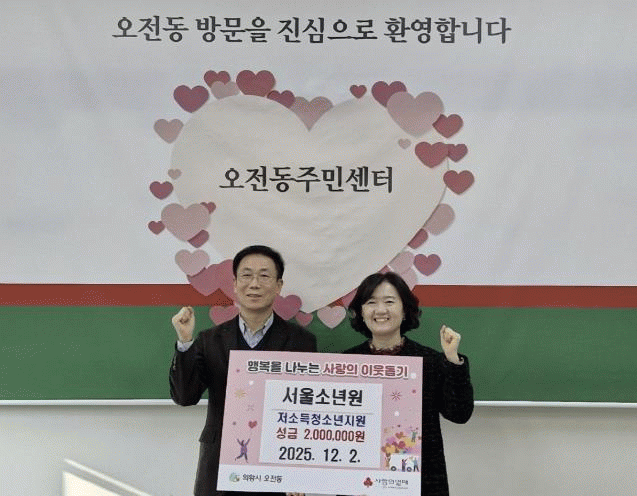 [NWS¹æ¼Û=Çѽ¸ñ ±âÀÚ]Àǿսà ¼¿ï¼Ò³â¿øÀº 12¿ù 2ÀÏ, ¿ÀÀüµ¿ÀÇ °æÁ¦Àû ¾î·Á¿òÀ» °Þ´Â û¼Ò³âµéÀ» Áö¿øÇϱâ À§ÇØ ÀåÇÐ±Ý 200¸¸ ¿øÀ» ¿ÀÀüµ¿Áֹμ¾ÅÍ¿¡ ±âŹÇϸç, Áö¿ª»çȸ¿¡ µû¶æÇÑ ¼Õ±æÀ» ÀüÇß´Ù.