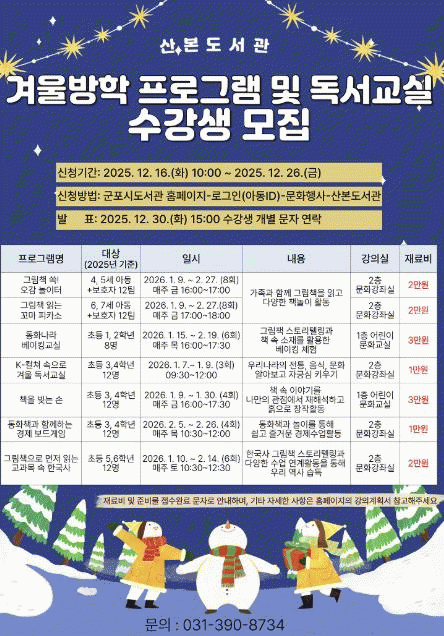 [NWS¹æ¼Û=Çѽ¸ñ ±âÀÚ]»êº»µµ¼°üÀº °Ü¿ï¹æÇÐÀ» ¸Â¾Æ À¯¾Æ ¹× ÃʵîÇлý ´ë»ó °Ü¿ï¹æÇÐ µ¶¼ÁøÈï ÇÁ·Î±×·¥ ¹× µ¶¼±³½ÇÀ» ¿À´Â 1¿ù 7ÀϺÎÅÍ 2¿ù 27ÀϱîÁö ¿î¿µÇÑ´Ù.
