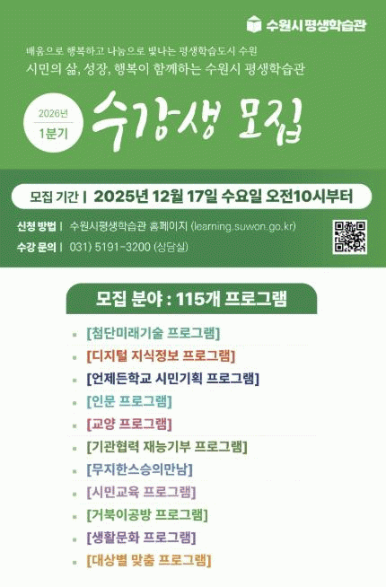 | ¼ö¿ø½ÃÆò»ýÇнÀ°ü, 2026³â 1ºÐ±â ÇÁ·Î±×·¥ ¼ö°»ý ¸ðÁý ÷´Ü¹Ì·¡±â¼ú¡¤»ýȰ¹®È ÇÁ·Î±×·¥ µî 11°³ °úÁ¤ 115°³ °Á °³¼³ =Çѽ¸ñ ±âÀÚ |
