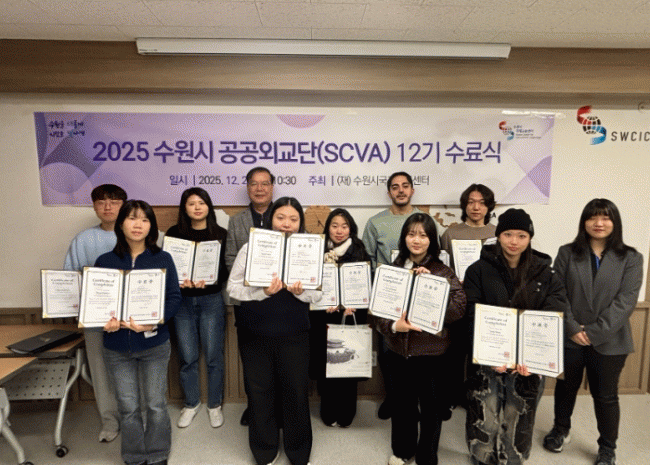 [NWS¹æ¼Û=Çѽ¸ñ ±âÀÚ]¼ö¿ø½Ã±¹Á¦±³·ù¼¾ÅͰ¡ 22ÀÏ ¼¾ÅÍ¿¡¼ ¡®¼ö¿ø½Ã °ø°ø¿Ü±³´Ü(SCVA) 12±â¡¯ ¼ö·á½ÄÀ» ¿°í, ´Ü¿ø 16¸í¿¡°Ô ¼ö·áÁõÀ» Àü´ÞÇß´Ù. ¿ì¼öȰµ¿ÀÚ 4¸í¿¡°Ô´Â »óÀåÀ» ¼ö¿©Çß´Ù.