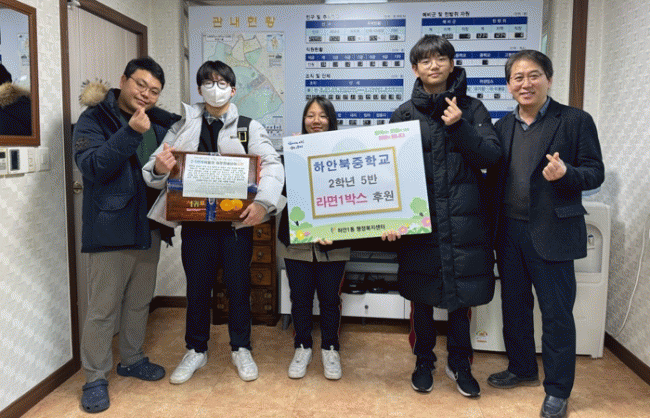 [NWS¹æ¼Û=Çѽ¸ñ ±âÀÚ]±¤¸í½Ã ÇϾȺÏÁßÇб³ 2Çгâ 5¹Ý ÇлýµéÀº Áö³­ 24ÀÏ ¿¬¸»À» ¸Â¾Æ Áö¿ª ³» ¾î·Á¿î ÀÌ¿ôÀ» µ½±â À§ÇØ ¡®Çлý 1ÀÎ 1¶ó¸é ±âºÎ¡¯ Ȱµ¿À¸·Î ¸ðÀº ¶ó¸é 1¹Ú½º¸¦ ÇϾÈ1µ¿ Áö¿ª»çȸº¸ÀåÇùÀÇü¿¡ Àü´ÞÇß´Ù.
