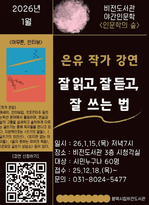 [NWS¹æ¼Û=Çѽ¸ñ ±âÀÚ]ÆòÅýà ºñÀüµµ¼°üÀº ´ÙÀ½ ´Þ 1¿ù 15ÀÏ Àú³á 7½Ã ÀºÀ¯ ÀÛ°¡¸¦ ÃÊûÇÏ¿© ¡®Àß Àаí, Àß µè°í, Àß ¾²´Â ¹ý¡¯À» ÁÖÁ¦·Î ¾ß°£ Àι®ÇÐ °¿¬À» ÁøÇàÇÑ´Ù.