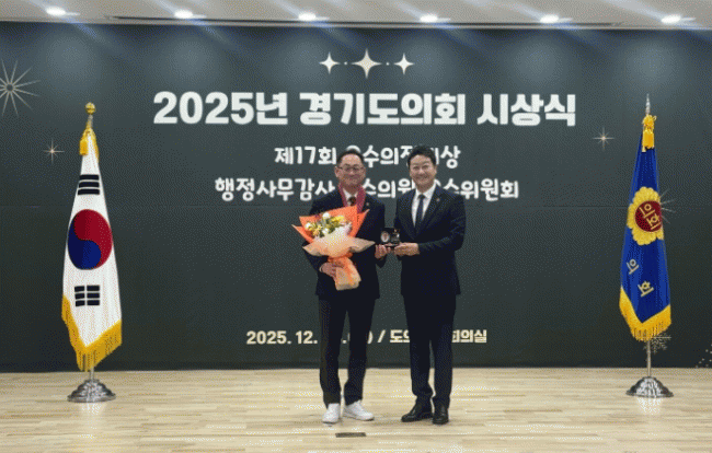 [NWS¹æ¼Û=Çѽ¸ñ ±âÀÚ]°æ±âµµÀÇȸ º¸°Çº¹ÁöÀ§¿øÈ¸ ¼Ò¼Ó ±è¿Ï±Ô ÀÇ¿ø(±¹¹ÎÀÇÈû, °í¾ç12)ÀÌ 12¿ù 26ÀÏ 2025³â ÇàÁ¤»ç¹«°¨»ç ¿ì¼öÀÇ¿ø¡¯À¸·Î ¼±Á¤µÅ ±ÝÀÏ ½Ã»óÀ» ¹Þ¾Ò´Ù. ±è¿Ï±Ô ÀÇ¿øÀº ¿ÃÇØ ÇàÁ¤»ç¹«°¨»ç¿¡¼ º¸°Ç¡¤º¹Áö ºÐ¾ß Àü¹ÝÀ» ´ë»óÀ¸·Î ±Ù°Å ¾ø´Â º¸°í¿Í º¸¿©ÁÖ±â½Ä ÇàÁ¤À» ¹Ù·ÎÀâ°í, ½ÇÁúÀûÀÎ Á¦µµ °³¼±À» À̲ø¾î³Â´Ù´Â Æò°¡¸¦ ¹Þ¾Ò´Ù.
