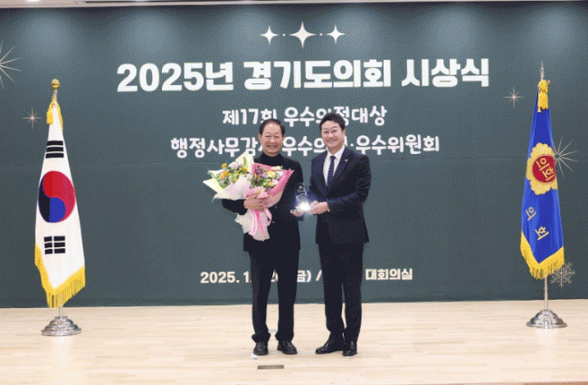 [NWS¹æ¼Û=Çѽ¸ñ ±âÀÚ]°æ±âµµÀÇȸ ¹®ÈüÀ°°ü±¤À§¿øÈ¸ À±À翵 ÀÇ¿øÀº 12¿ù 26ÀÏ °æ±âµµÀÇȸ ´ëȸÀǽǿ¡¼ ¿¸° ´ëÇѹα¹½ÃµµÀÇȸÀÇÀåÇùÀÇȸ Á¦17ȸ ¡®¿ì¼öÀÇÁ¤´ë»ó¡¯ ½Ã»ó½Ä¿¡¼ ¿ì¼öÀÇÁ¤´ë»óÀ» ¼ö»óÇß´Ù.