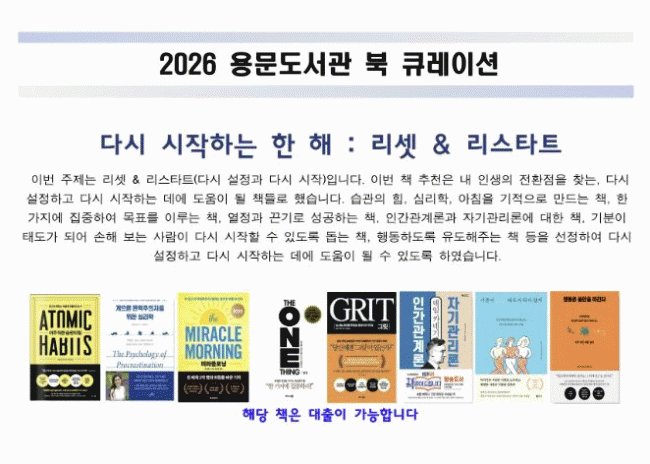 [NWS¹æ¼Û=Çѽ¸ñ ±âÀÚ]¾çÆò±ºÀº Áö³ 2ÀϺÎÅÍ 2¿ù 28ÀϱîÁö ¿ë¹®µµ¼°ü¿¡¼ ¡®´Ù½Ã ½ÃÀÛÇÏ´Â ÇÑ ÇØ : ¸®¼Â & ¸®½ºÅ¸Æ®(´Ù½Ã ¼³Á¤°ú ´Ù½Ã ½ÃÀÛ)¡¯¸¦ ÁÖÁ¦·Î ÇÑ µµ¼ Ãßõ ¼ºñ½º(ºÏ Å¥·¹À̼Ç)¸¦ ¿î¿µÇÑ´Ù°í ¹àÇû´Ù.