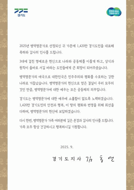 ±èµ¿¿¬ °æ±âµµÁö»ç´Â ¼Çѹ®À» ÅëÇØ ¡°º´¿ª¸í¹®°¡ÀÇ ¾Ö±¹À¸·Î ´ëÇѹα¹Àº ¹ÎÁÖÁÖÀÇ¿Í Æòȸ¦ ¼öÈ£ÇÏ´Â °ÇÑ ³ª¶ó·Î °Åµì³µ´Ù¡±¸é¼ ¡°°æ±âµµ´Â º´¿ª¸í¹®°¡¿¡ ´ëÇÑ ¿¹¿ì¿¡ ¼ÒȦÇÔÀÌ ¾øµµ·Ï ³ë·ÂÇϰÚÀ¸¸ç, Çå½Å¿¡ º¸´äÇϰڴ١±°í °¨»ç¿Í Á¸°æÀÇ ¶æÀ» Ç¥ÇöÇß´Ù.