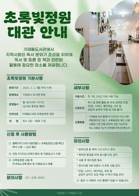 [NWS¹æ¼Û=Çѽ¸ñ ±âÀÚ]ÀÇÁ¤ºÎ°¡Àç¿ïµµ¼°üÀº ½Ã¹ÎµéÀÇ µ¶¼ ¹× Åä·Ð Ȱµ¿À» Áö¿øÇϱâ À§ÇØ µµ¼°ü °ø°£ÀÎ ¡®ÃʷϺûÁ¤¿ø¡¯À» 2¿ù 2ÀϺÎÅÍ ¿¹¾àÀÚ¿¡ ÇÑÇØ °³¹æÇÑ´Ù.