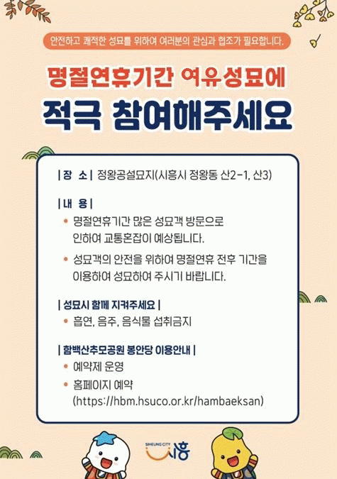 Á¤¿Õ°ø¼³¹¦Áö(Á¤¿Õµ¿ »ê2-1, »ê 3)´Â ½ÃÈï½Ã À¯ÀÏÀÇ °ø¼³¹¦Áö·Î, ¸Å³â ¼³°ú Ãß¼® µî ¸íÀý ´çÀÏ¿¡ ¸Å³â ¸¹Àº ¼º¹¦°´ÀÌ ¹æ¹®Çϰí ÀÖ´Ù. ƯÈ÷ ¿ÃÇØ ¼³ ¸íÀý¿¡´Â ¼º¹¦°´ÀÌ ¿¹³âº¸´Ù ´õ Áõ°¡ÇÒ °ÍÀ¸·Î ¿¹»óµÅ ±³Åë È¥Àâ°ú ÁÖÂ÷ ºÒÆí, ¾ÈÀü»ç°í¸¦ ÃÖ¼ÒÈÇϱâ À§ÇØ ¸íÀý Àü¡¤ÈÄ ºÐ»ê ¹æ¹®¿¡ ´ëÇÑ ½Ã¹ÎµéÀÇ Àû±ØÀûÀÎ ÇùÁ¶°¡ ¿ä±¸µÈ´Ù.