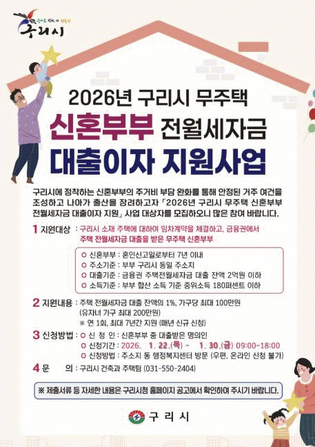 [NWS¹æ¼Û=Çѽ¸ñ ±âÀÚ]±¸¸®½Ã´Â °ü³» ¹«ÁÖÅà ½ÅÈ¥ºÎºÎÀÇ Áְźñ ºÎ´ãÀ» ¿ÏÈÇϰí ÀúÃâ»ê ¹®Á¦ ±Øº¹¿¡ À̹ÙÁöÇϱâ À§ÇØ '2026³â ¹«ÁÖÅà ½ÅÈ¥ºÎºÎ Àü¿ù¼¼ ÀÚ±Ý ´ëÃâÀÌÀÚ Áö¿ø»ç¾÷'À» ¿À´Â 1¿ù 22ÀϺÎÅÍ ½ÃÇàÇÑ´Ù.