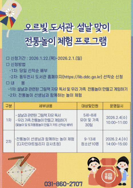 À̹ø ÇÁ·Î±×·¥Àº °¡Á·ÀÌ ÇÔ²² Âü¿©ÇÏ¸ç ¼¼´ë °£ ¼ÒÅëÀÇ ÆøÀ» ³ÐÈ÷°í, ¼³ ¸íÀýÀÇ ÀÇ¹Ì¿Í ÀüÅ빮ȸ¦ ÀÚ¿¬½º·´°Ô üÇèÇÒ ¼ö ÀÖµµ·Ï ±âȹµÆ´Ù. ¼³³¯ °ü·Ã ±×¸²Ã¥ ÀÚÀ¯µ¶¼¸¦ ºñ·ÔÇØ ¸¸µé±â ŰƮ¸¦ Ȱ¿ëÇÑ À·³îÀÌ¿Í ÅëÅë³îÀÌ Á¦ÀÛ ¹× °ÔÀÓ Ã¼Çè, ÀüÅë³îÀÌ ¼±»ý´Ô°ú ÇÔ²²ÇÏ´Â ÅõÈ£ µî üÇè Áß½ÉÀÇ ´Ùä·Î¿î ÇÁ·Î±×·¥À¸·Î ¿î¿µµÉ ¿¹Á¤ÀÌ´Ù.