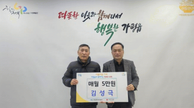 [NWS¹æ¼Û=Çѽ¸ñ ±âÀÚ]°¡Æò±º °¡ÆòÀ¾ ÁֹΠ±è¼º±Ø ¾¾°¡ Ãë¾à°èÃþ ÀÌ¿ôµ½±â ¼º±ÝÀ¸·Î ¸Å¿ù 5¸¸ ¿øÀ» °¡ÆòÀ¾ ÇàÁ¤º¹Áö¼¾ÅÍ¿¡ Á¤±â±âŹÇϱâ·Î Çß´Ù.