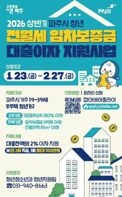 | ÆÄÁÖ½Ã, 2026³â »ó¹Ý±â û³â Àü¿ù¼¼ ÀÓÂ÷º¸Áõ±Ý ´ëÃâÀÌÀÚ Áö¿ø 1¿ù 23ÀϺÎÅÍ 2¿ù 27ÀϱîÁö Á¢¼ö =Çѽ¸ñ ±âÀÚ |