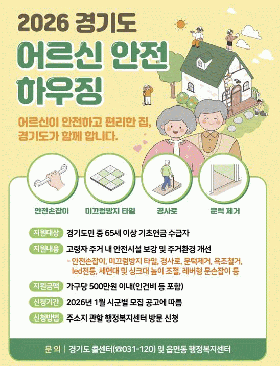 ¡®¾î¸£½Å ¾ÈÀüÇϿ졡¯Àº ±âÃÊ¿¬±Ý ´ë»óÀÚ 7¸í(¼±Á¤ 5¸í, ¿¹ºñ 2¸í)À» ´ë»óÀ¸·Î ¾ÈÀü ¼ÕÀâÀÌ, ¹Ì²ô·³¹æÁö ¹Ù´ÚÀç, °¡½º¾ÈÀüÀåÄ¡ µî ÁÖÅà ¾ÈÀü ¼³ºñ ¼³Ä¡¡¤º¸¼ö¸¦ Áö¿øÇÑ´Ù.