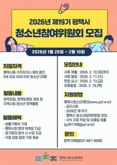 [NWS¹æ¼Û=Çѽ¸ñ ±âÀÚ]ÆòÅÃ½Ã¿Í ÆòÅýÃû¼Ò³âÀç´ÜÀº û¼Ò³â Á¤Ã¥ Âü¿© ±âȸ¸¦ È®´ëÇϰí ÀÚÄ¡ ¿ª·®À» °ÈÇϱâ À§ÇÑ 2026³â Á¦19±â û¼Ò³âÂü¿©À§¿øÈ¸ À§¿ø 20¸íÀ» °ø°³ ¸ðÁýÇÑ´Ù°í ¹àÇû´Ù.