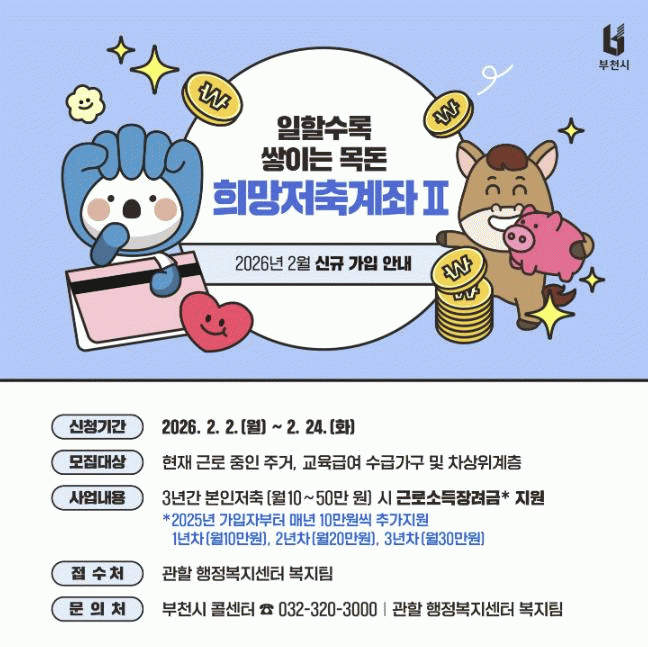 | ºÎõ½Ã, 2026³â Èñ¸ÁÀúÃà°èÁÂ(¥±) °¡ÀÔÀÚ ¸ðÁý ¡°ÀÏÇÒ¼ö·Ï ½×ÀÌ´Â ¸ñµ·¡±¡¦ÀÚ»êÇü¼ºÁö¿øÀ¸·Î ÀÚ¸³¿ª·® °È =Çѽ¸ñ ±âÀÚ |